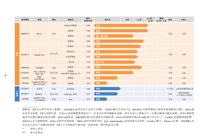 招股书显示创胜集团目前有1种核心产品MSB2311,一种针对实体瘤的人源化PD-L1单抗候选药物,以及4种关键候选药物和多种前期创新生物候选药物。但从研发情况来看,均处于或早于临床2期阶段。