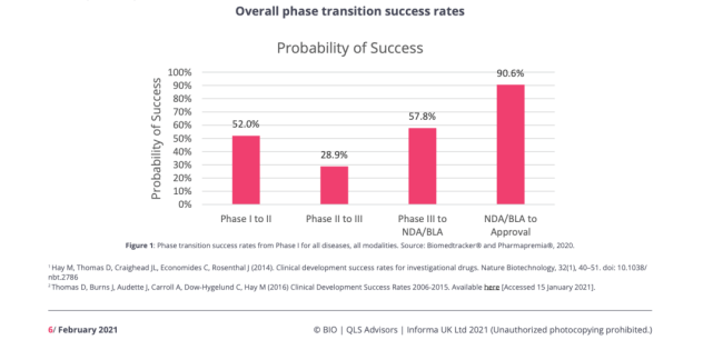 当然,更大的风险还是来源于候选药物临床前及临床开发有关的风险。来自BIO的报告显示,1期临床到2期的成功率为52%,但2期到3期临床的成功率仅有28.9%。肿瘤领域的药物开发成功率更低,从临床到上市仅有5.3%。过去一年备受瞩目的HIV疫苗、罗氏三阴性乳腺癌药物、Catabasis的杜兴氏肌营养不良症药物均在临床阶段失败。