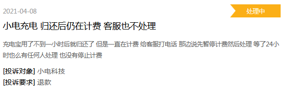 另一位用户表示,在借了充电宝用了不到一小时后就归还了,但是却一直在计费,给客服打电话后,客服表示先暂停计费然后处理,但是该用户等了24小时也没有任何人处理此事,期间共享充电宝也没有停止计费。