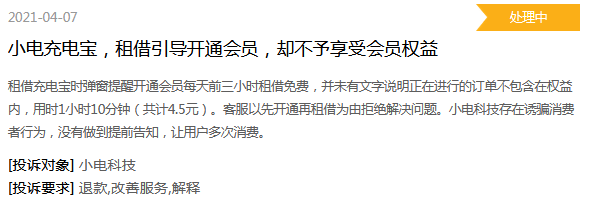 然而一位用户表示,自己租借充电宝时弹窗提醒开通会员每天前三小时租借免费,并未有文字说明正在进行的订单不包含在权益内,用时1小时10分钟(共计4.5元),客服以先开通再租借为由拒绝解决问题。目前,该投诉显示状态显示为正在处理中。