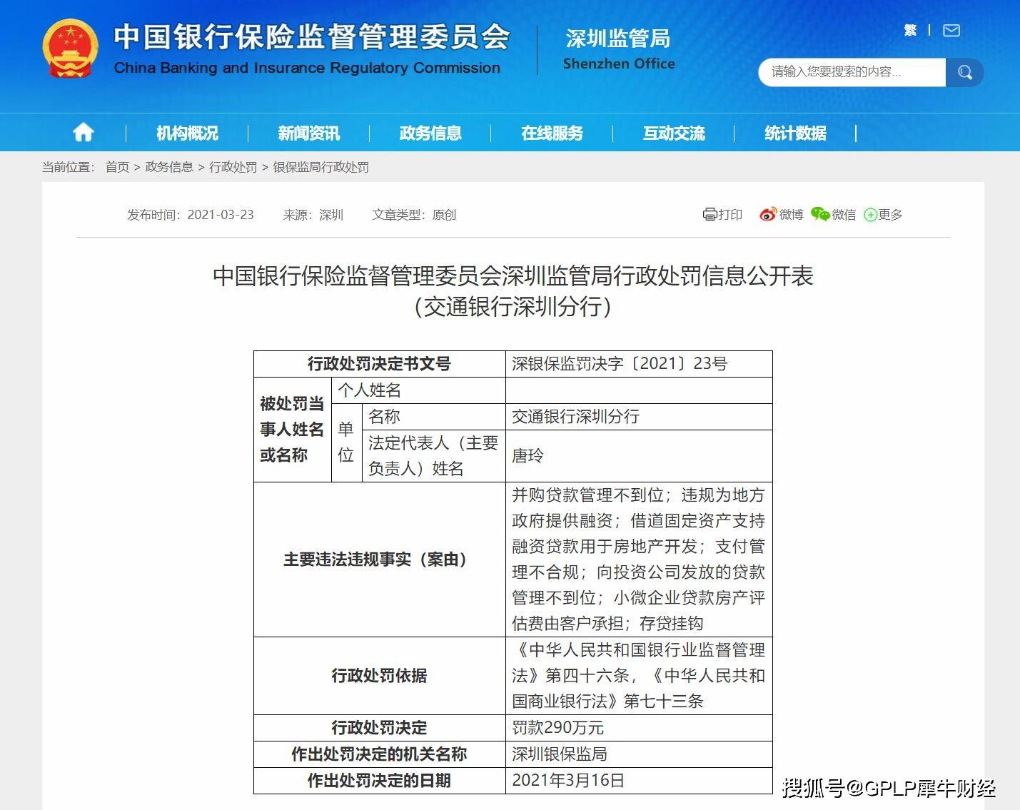 2021年3月23日,中国银保监会发布公告称,交通银行深圳分行因并购贷款管理不到位等违规,被深圳银保监局罚款290万元。