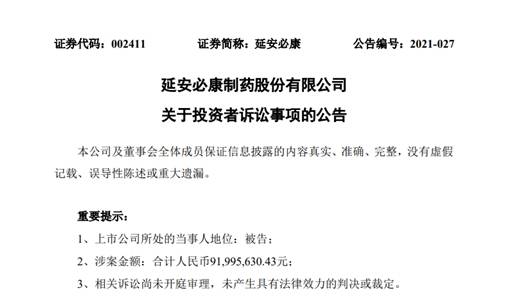 中国经济网4月9日讯(记者 朱国旺 郭文培) 2020年10月,由于控股股东占用巨资不披露、3年年报造假等信披违法行为,延安必康及24位负责人被警告、罚款。然而,当前该事件仍未平息。4月8日,延安必康公告,公司于4月1日收到陕西省西安市中级人民法院(简称“西安中院”)《民事起诉状》等有关证据材料,涉及458名自然人投资者以证券虚假陈述责任纠纷为由对公司提起民事诉讼,诉讼金额共计9155.53万元。