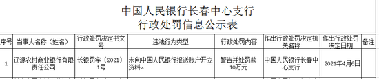 辽源农商行被罚10万元:未向人民银行报送账户开立资料