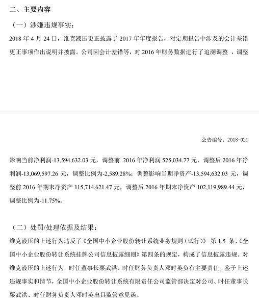 此外,本网记者在梳理维克液压挂牌新三板期间发布的公告发现,公司曾因财务数据的调整而被监管部门认定信息披露违规。