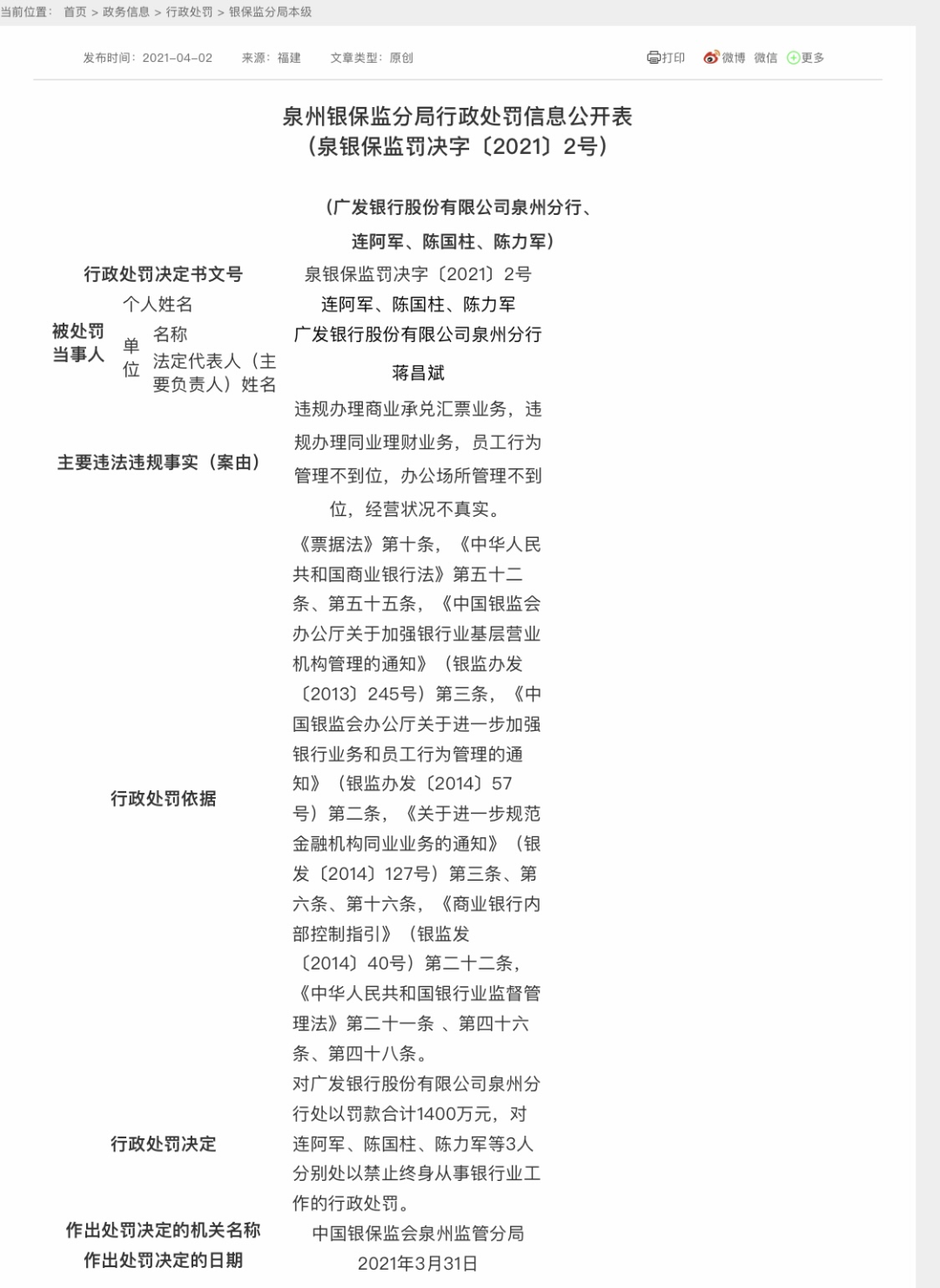 第一宗罪是:违规办理商业承兑汇票业务,违规办理同业理财业务,员工行为管理不到位,办公场所管理不到位,经营状况不真实。对此,监管对广发银行泉州分行处以罚款合计1400万元,对连阿军、陈国柱、陈力军等3人分别处以禁止终身从事银行业工作的行政处罚。