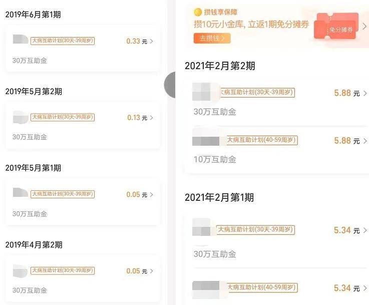 张丽(化名)告诉记者,自己于2019年在支付宝里看到有关相互宝的推荐,了解情况后决定参与该互助计划。2019年1月,张丽的分摊费用为0.03元,第一次参与分摊互助的时候,该费用由平台承担了。此后张丽又为其母亲办理加入了相互宝,刚加入时分摊费用仅为每期几分钱至几毛钱,此后费用逐渐上涨,最近已上涨至每期5.88元。