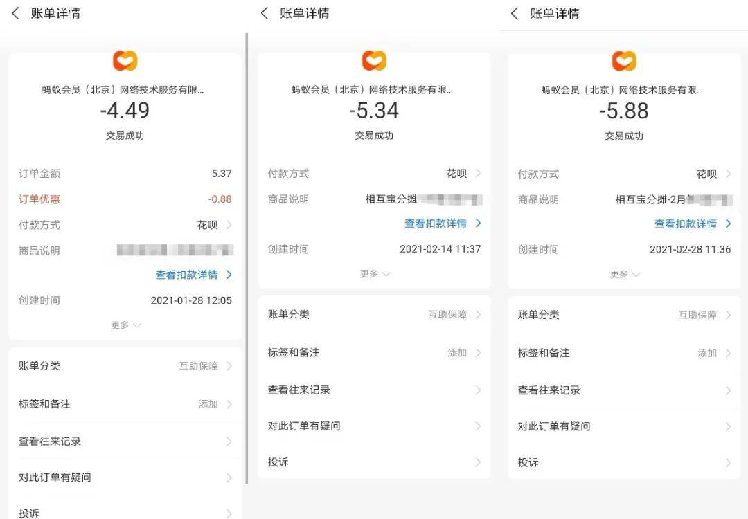今年2月,孟女士在查看支付宝账单时偶然发现有一项分类为“互助保障”的扣费明细,点进该笔消费明细,才了解到该扣费为相互宝的分摊费用,从1月底开始扣费,至今已经被扣除过3次。