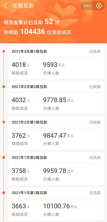 蚂蚁金服研究院曾发布行业内首份网络互助白皮书——《网络互助行业白皮书》,白皮书数据显示,2019年我国网络互助平台的实际参与人数为1.5亿人,预计2025年将达到4.5亿人,覆盖中国14亿人口的32%左右。在这1.5亿人中,有超1亿人来自相互宝。而现实中,相互宝用户人数却在逐渐减少,2021年3月,分摊人数已降至9593万人,较最高峰时期相比有近千万人退出相互宝。部分用户表示,是由于分摊费用上涨导致。