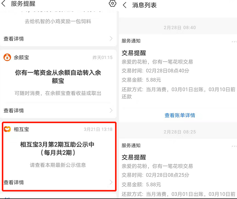 此外,多位投诉者表示,相互宝在扣费时并无消费记录,也无及时扣款通知,仅可在支付宝账单里查看。张丽(化名)向记者表示,其可在支付宝首页服务提醒处查看相互宝公示,但服务提醒内并无扣费提醒。由于选择的扣款方式为花呗,张丽可在花呗的消息列表及时看见相互宝相关扣费,但点击花呗明细,并不能查看所扣金额的具体用途。