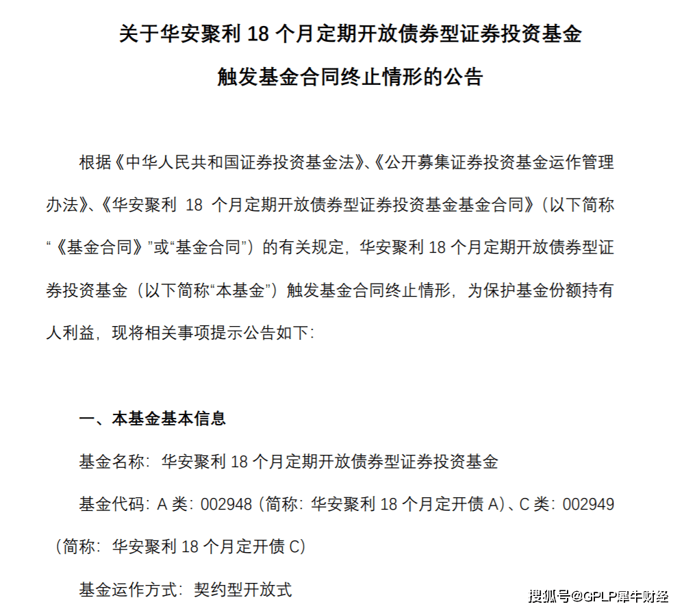 2021年4月1日,华安基金发布公告称,华安基金旗下华安聚利18个月定开债A/C(002948/002949)因触发基金合同终止情形,将于3月31日后进入清算程序。