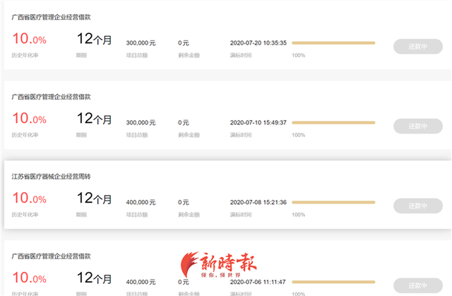公开资料显示,医界贷系医信金融信息服务(上海)有限公司旗下网络借贷平台,2014年1月1日正式上线,是国内首家专注于医疗行业融资与理财业务的P2P平台,2016当选为上海互联网金融行业协会理事单位。在医界贷官网“出借项目”一栏显示,借款历史年化率在7%—11%之间,借款期限为1-18个月,借款金额20-100万之间。不过,在最近120起借款项目中,借款方涉及福建、上海、四川、重庆、广西等全国各地医疗管理公司,最长一笔标满时间为2019年11月,最短一笔标满时间为2020年7月20日,均出现逾期不还的情况。