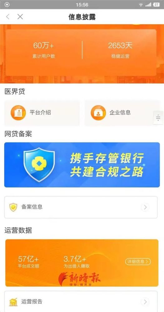 新时报记者登录医界贷官网发现,最新一条“平台动态”时间为2019年9月4日,文章题目为《亿路成长,奋步前行,医界贷交易额突破57亿》,之后再无更新。目前,企业贷和个人贷项目均已停止,医界贷APP已经无法下载,微信公众号也已在2019年8月19日停止更新。