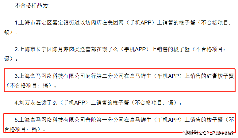 不合格批次产品中,盒马占据两项。