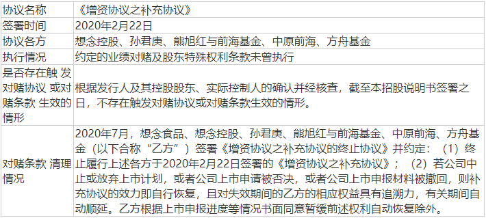 招股书显示,2020年2月22日,想念控股、孙君庚、熊旭红与前海基金、中原前海、方舟基金签订《增资协议之补充协议》并约定了业绩对赌及股东特殊权利条款。其对赌条款主要涉及:业绩对赌、股份转让限制、反稀释权、股份回购、清算分配权和最优条款权等,主要条款情况如下:
