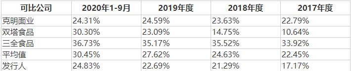 再来看一下想念食品的毛利率情况。招股书显示,2017-2020年前三季度,想念食品的主营业务毛利率分别为17.17%、21.29%、22.69%和24.83%,低于同期同行业可比公司主营业务毛利率均值,即22.45%、24.63%、27.62%和30.45%。由此可见,尽管想念食品与行业均值的主营业务毛利率均在增长,但想念食品的毛利率明显不及同行。