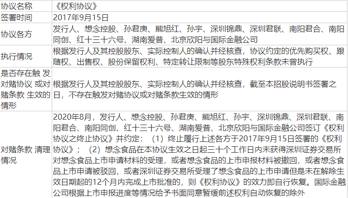 据招股书披露,2017年9月15日,想念食品、想念控股、孙君庚、熊旭红等股东与国际金融公司签订《权利协议》并约定了优先购买权、跟随权、出售权、股份保留权利、特定转让限制等股东特殊权利条款。同日,想念控股、孙君庚、熊旭红、孙宇还与国际金融公司签订《发起人承诺协议》并约定了业绩承诺、出售权等股东特殊权利条款。