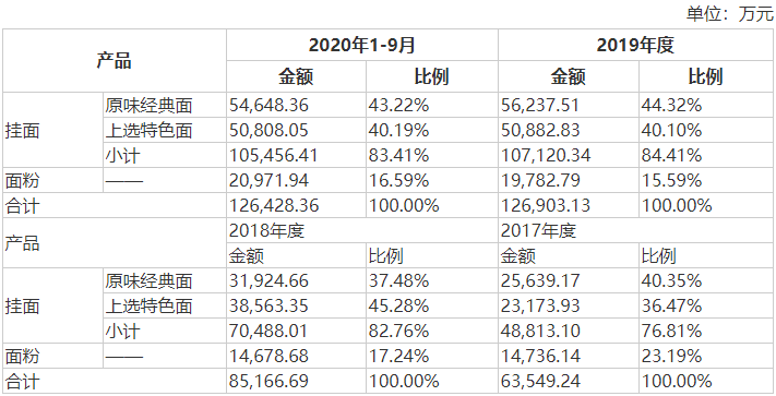 首先来看产品情况。据招股书披露,报告期内想念食品的挂面销售收入分别为4.88亿元、7.05亿元、10.71亿元和10.55亿元,占各期主营业务收入的比例分别为76.81%、82.76%、84.41%和83.41%,产品集中度较高,产品单一的问题较为严重。