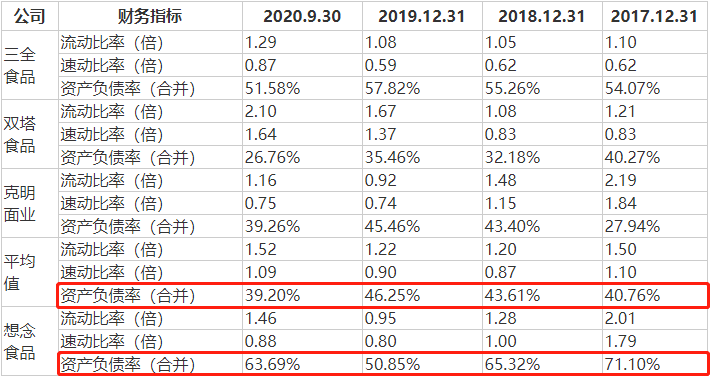 最后我们来关注一下想念食品的偿债能力。2017-2020年前三季度,想念食品资产负债率(合并)分别为71.10%、65.32%、50.85%和63.69%,高于同行业可比公司资产负债率(合并)均值,即40.76%、43.61%、46.25%和39.20%。