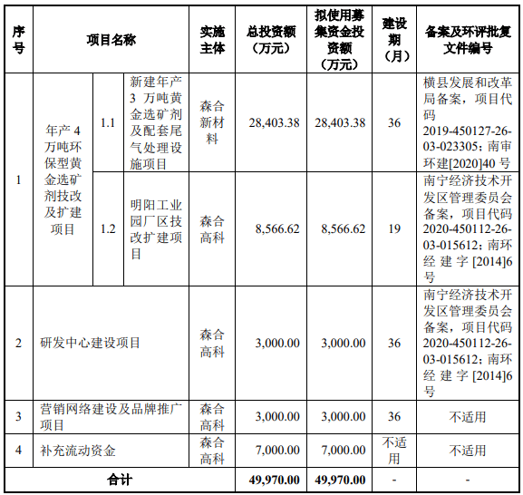 森合高科原拟在深交所创业板募集资金5.00亿元,其中2.84亿元用于“新建年产3万吨黄金选矿剂及配套尾气处理设施项目”、8566.62万元用于“明阳工业园厂区技改扩建项目”、3000.00万元用于“研发中心建设项目”、3000万元用于“营销网络建设及品牌推广项目”、7000万元用于“补充流动资金”。