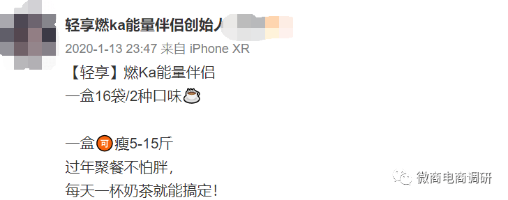 一位昵称带有“轻享燃ka能量伴侣创始人”字样的微博用户,还专门指出“轻享燃Ka能量伴侣一盒可瘦5到10斤”。