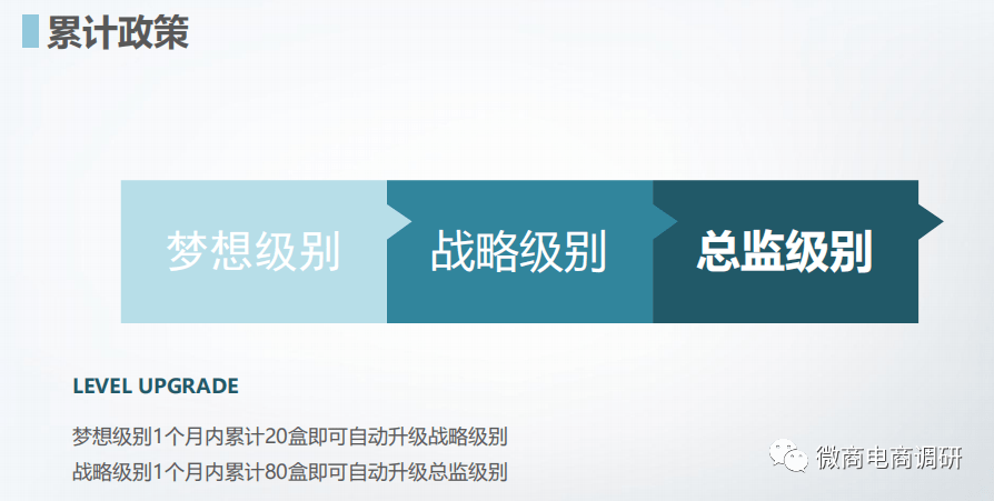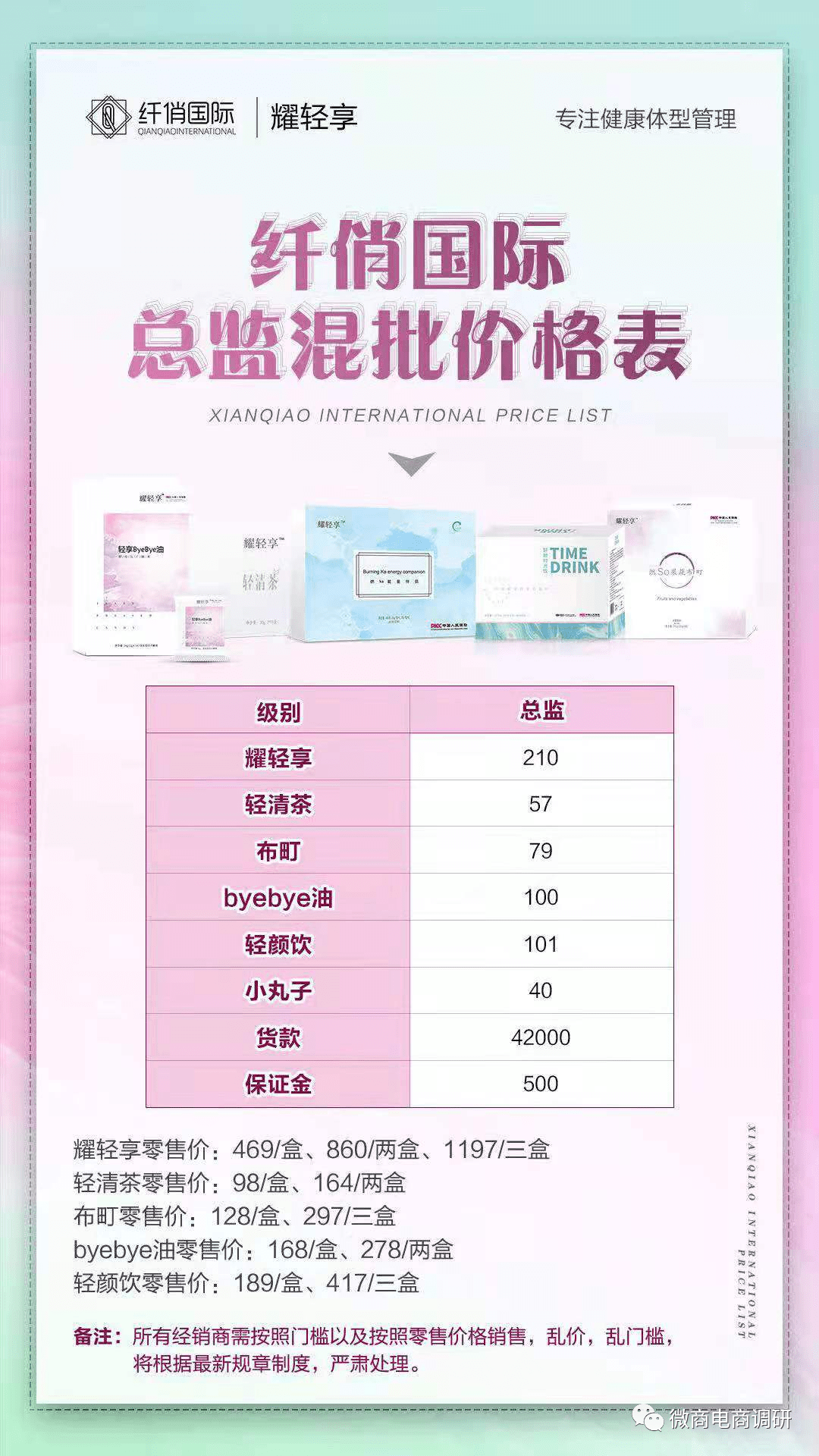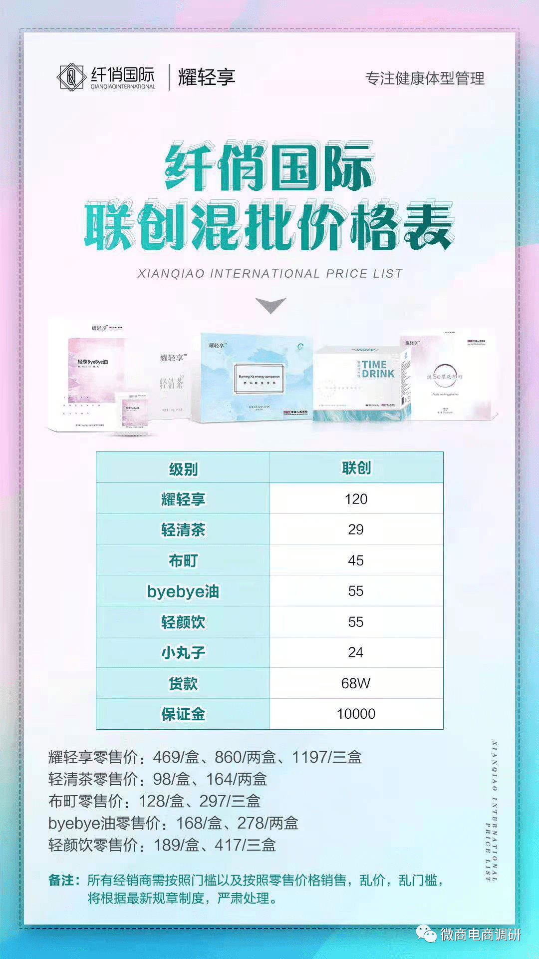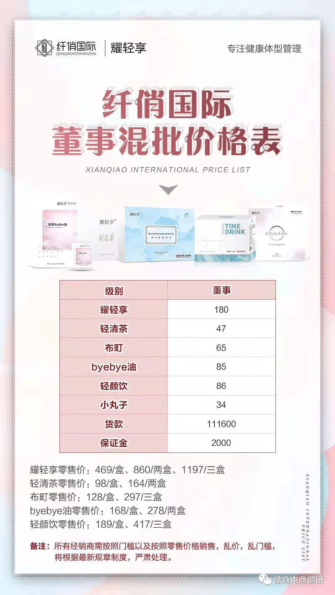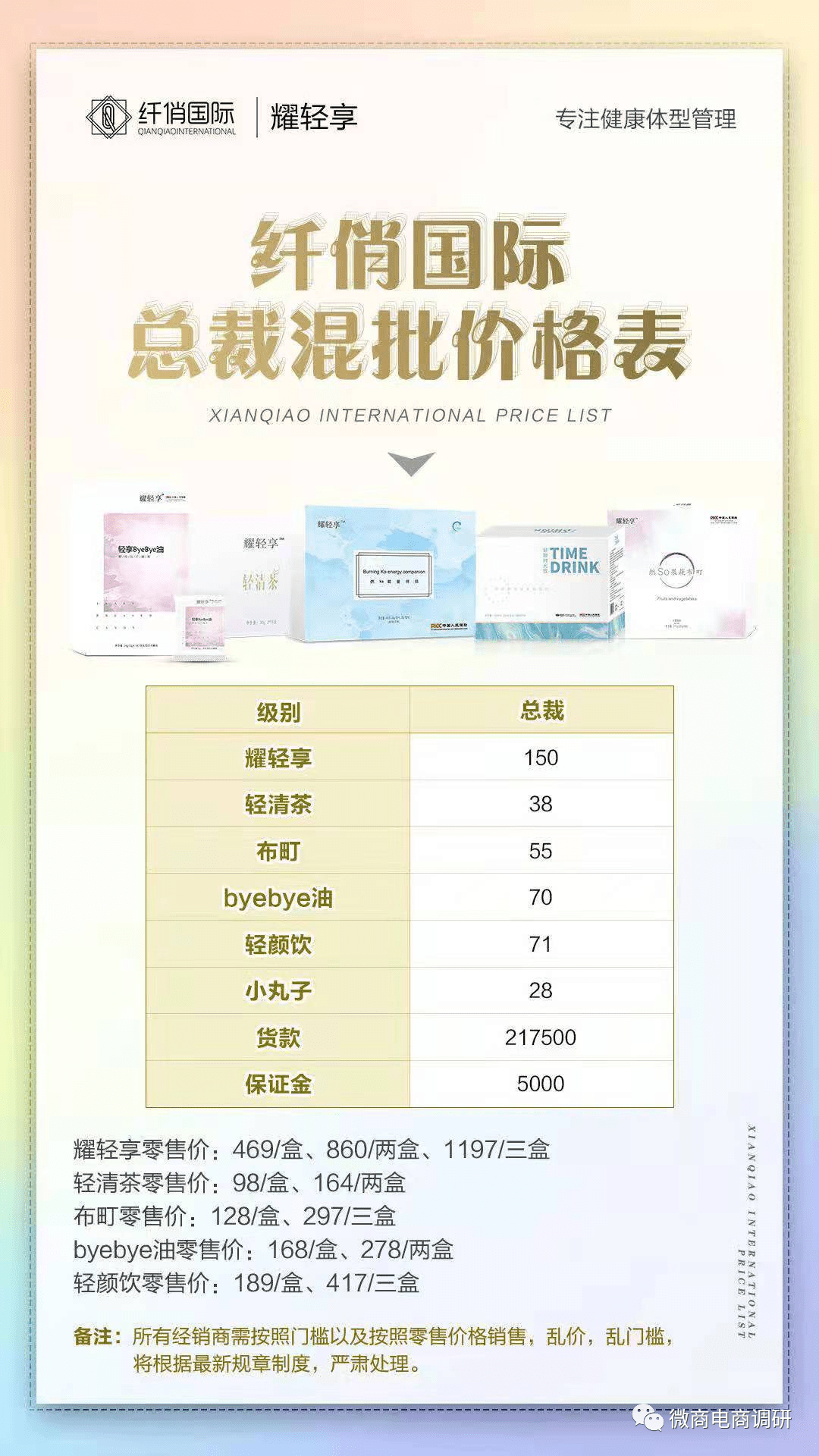 不同的代理级别对应的拿货折扣自然不同,我们以产品“耀轻享”为例,该产品的零售价为每盒469元(两盒860元,三盒1197元),VIP的拿货价为265元,战略的拿货价为237元,总监的拿货价为210元,董事的拿货价为180元,总裁的拿货价为150元,联创的拿货价为120元。