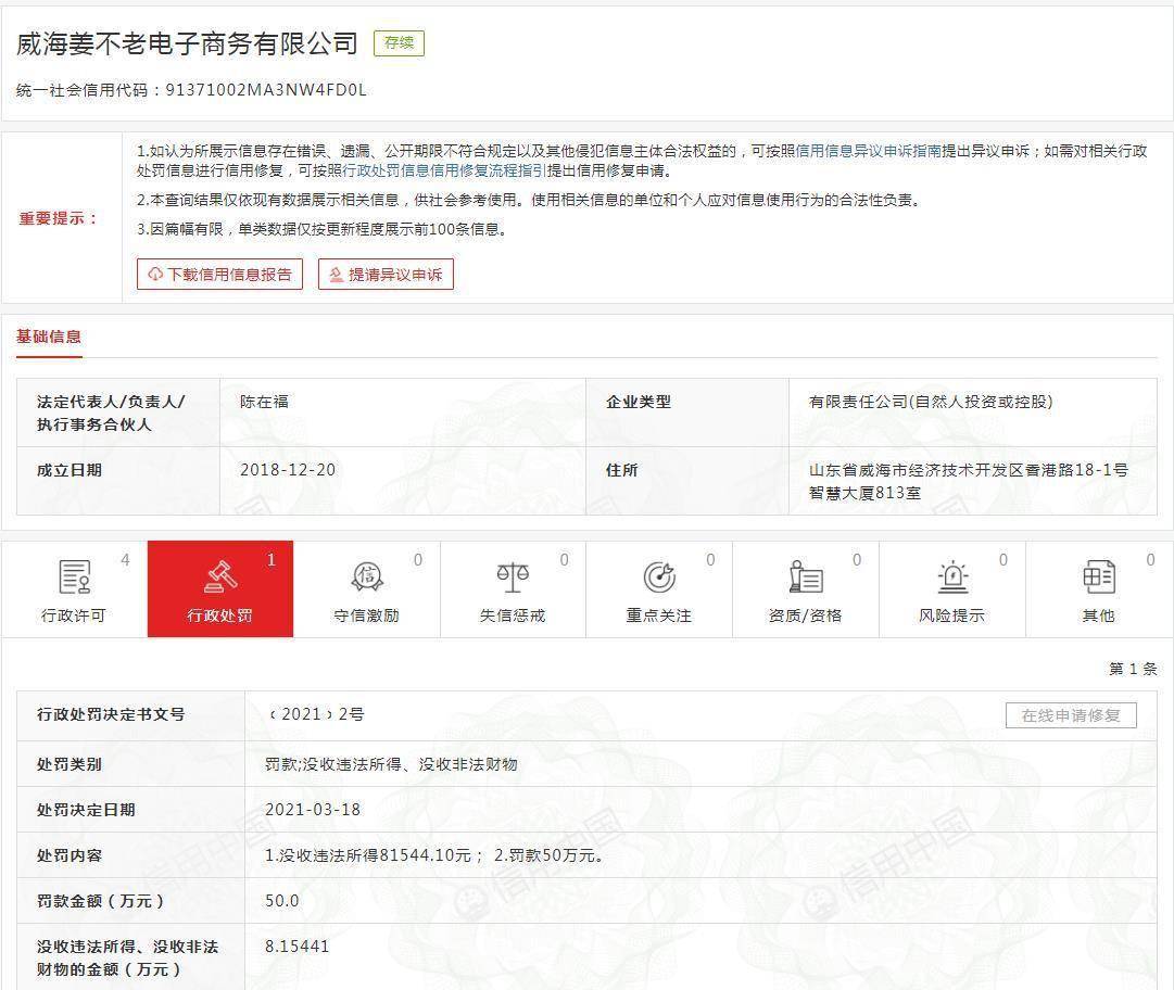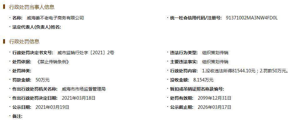 中国网财经4月13日讯(记者 段思琦)近期,中国网财经记者从国家企业信用信息公示系统注意到一则行政处罚信息(威市监销行处字〔2021〕2号),威海姜不老电子商务有限公司因组织策划传销被威海市市场监督管理局罚款50万元,没收违法所得81544.10元。