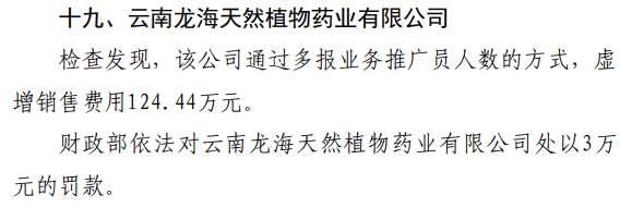 其中,检查发现,云南龙海天然植物药业有限公司通过多报业务推广员人数的方式,虚增销售费用124.44万元。