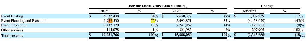 具体来看,普普文化收入下滑主要是由其活动策划和执行业务、营销业务收入下滑所致。招股书显示,2019财年,该公司来自活动策划和执行业务、营销业务的收入分别为995.25万美元、243.27万美元,而2020财年,来自上述业务的收入分别为549.39万美元、224.19万美元,较2019财年分别下降445.86万美元、19.08万美元。