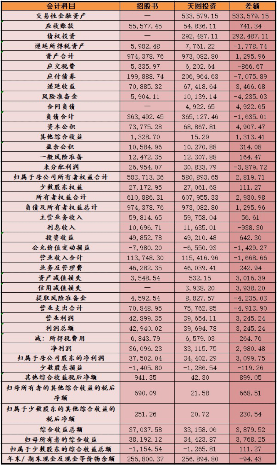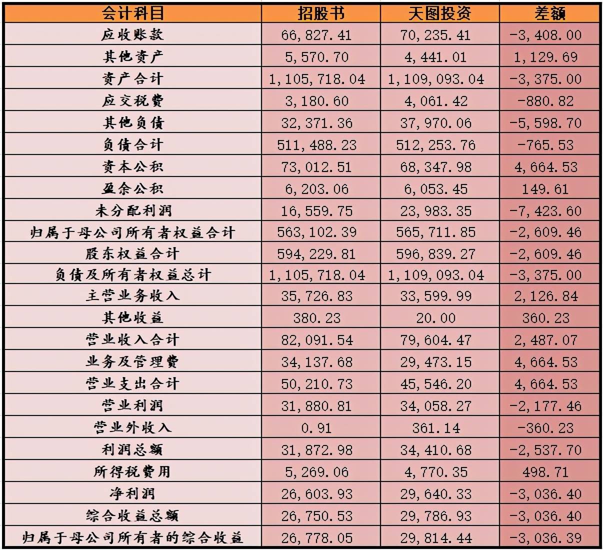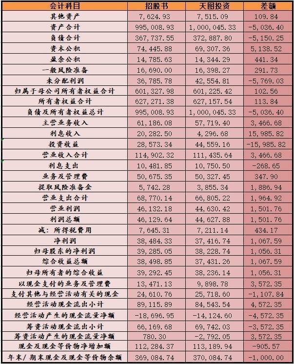 综上,招股书中财务数据与天图投资年报中披露的相对应财务数据中,有多处数据存在百万元或者千万元以上的出入,其中数据金额差异最大的会计科目为2018年的交易性金融资产,差额达数十亿元。