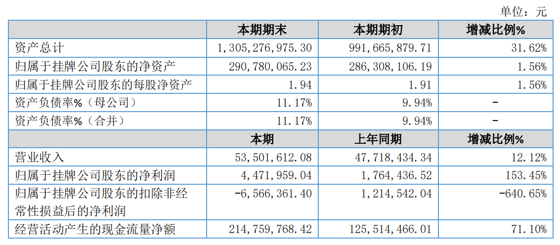 报告期内,公司实现0.54亿元,12.12%,实现0.04亿元,同比增长153.45%。净资产收益率1.55%,每股净资产为1.94元,基本1.43元。