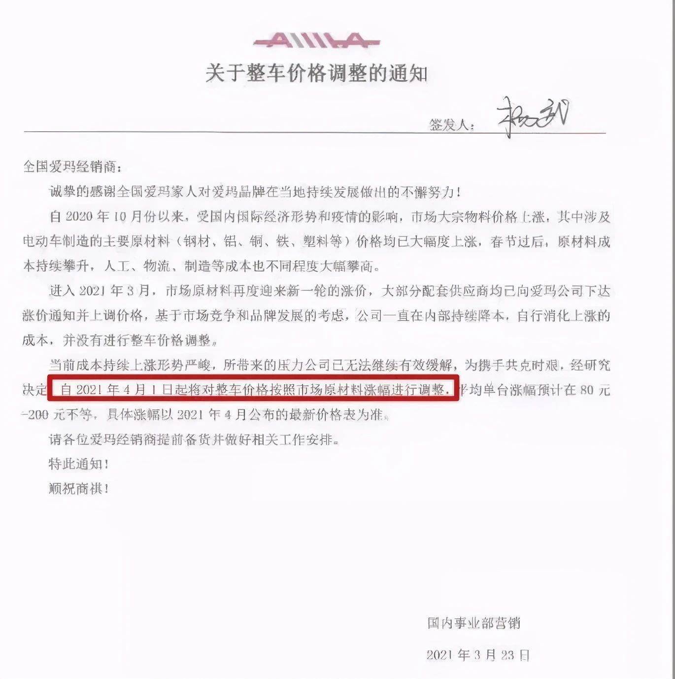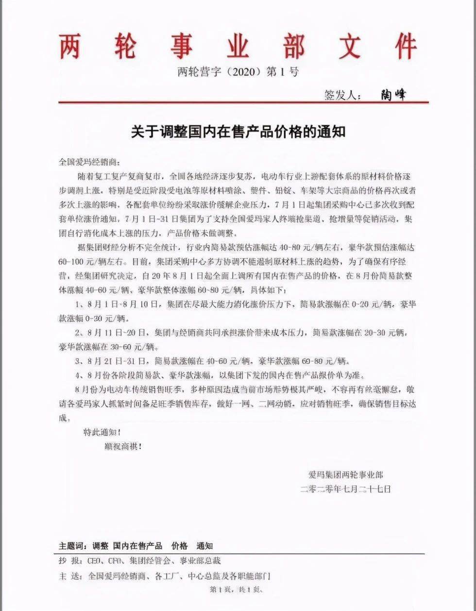 近期,网络上流传出2021年3月23日爱玛科技致全国爱玛经销商《关于整车价格调整的通知》消息。该“通知”显示,当前成本持续上涨形势严峻,所带来的压力公司已无法继续有效缓解,为携手共克时艰,经研究决定,自2021年4月1日起将整车价格按照市场原材料涨幅进行调整,平均单台涨幅预计在80元-200元不等,具体涨幅以2021年4月公布的最新价格表为准。