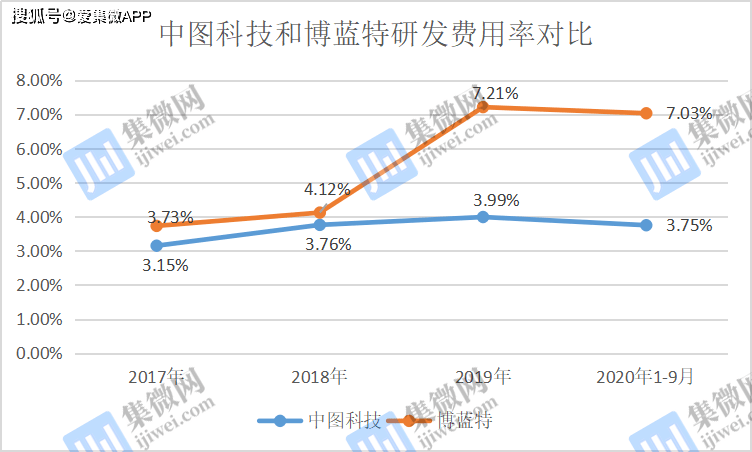 而中图科技的研发费用率分别为3.15%、3.76%、3.99%、3.75%;而同行公司博蓝特的研发费用率分别为3.73%、4.12%、7.21%、7.03%。可见,相比同行业可比公司,中图科技在研发费用率明显偏低,这就难免令人担忧,其在研发上的投入是否足够支撑企业的发展。