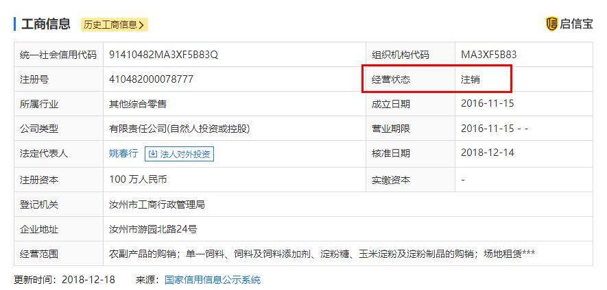 还有一条值得关注且较为蹊跷的信息。河南龙翔宇实业有限公司成立于2016年11月,是拓新药业2017年第一大供应商,供应腺苷金额为293.68万元,也就是说刚刚成立不久就成为了拓新药业的第一大供应商。企信网提供的信息显示,该公司现在的经营状态为“注销”,注销日期为2018年12月14日。
