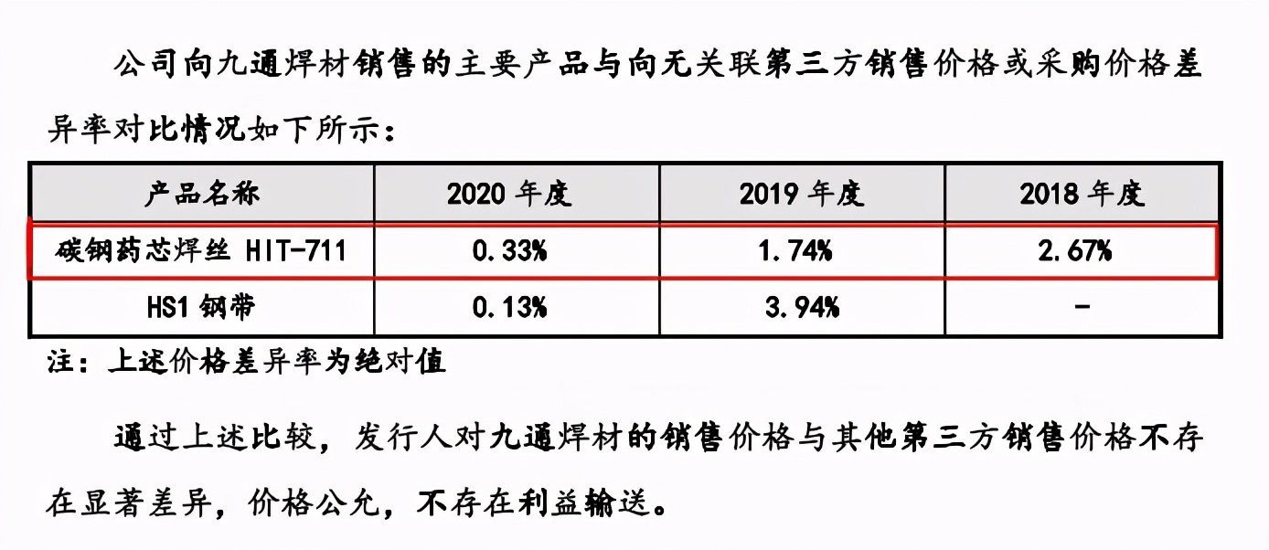 虽然解释中哈焊华通向企业采购和销售的焊丝类型不同,但是在公司向九通焊材采购/销售的主要产品与无关联方采购价格对比中所列示的产品皆有药芯焊丝,采购产品中并无列示实心焊丝,焊丝E7T-1C-1.2在招股书中并无明确归类。哈焊华通在招股书中也将焊丝分别为实心焊丝、药芯焊丝两类,以实心焊丝销售为主,药芯焊丝销售为辅。