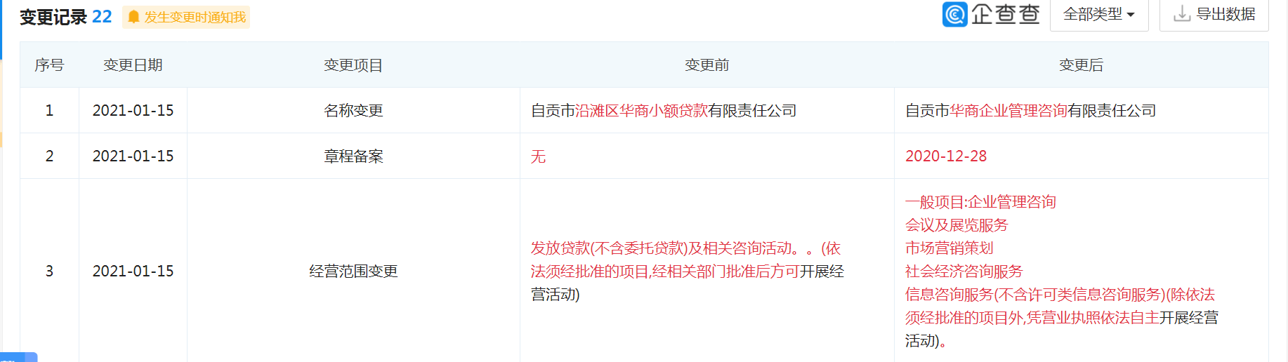 企查查显示,2021年1月15日,也就是更新招股书的前三天,该公司由“自贡市沿滩区华商小额贷款有限责任公司”变更为了“自贡市华商企业管理咨询有限责任公司”。经营范围也由“发放贷款”变更为了“企业管理咨询;会议及展览服务;市场营销策划;社会经济咨询服务;信息咨询服务(不含许可类信息咨询服务)”。