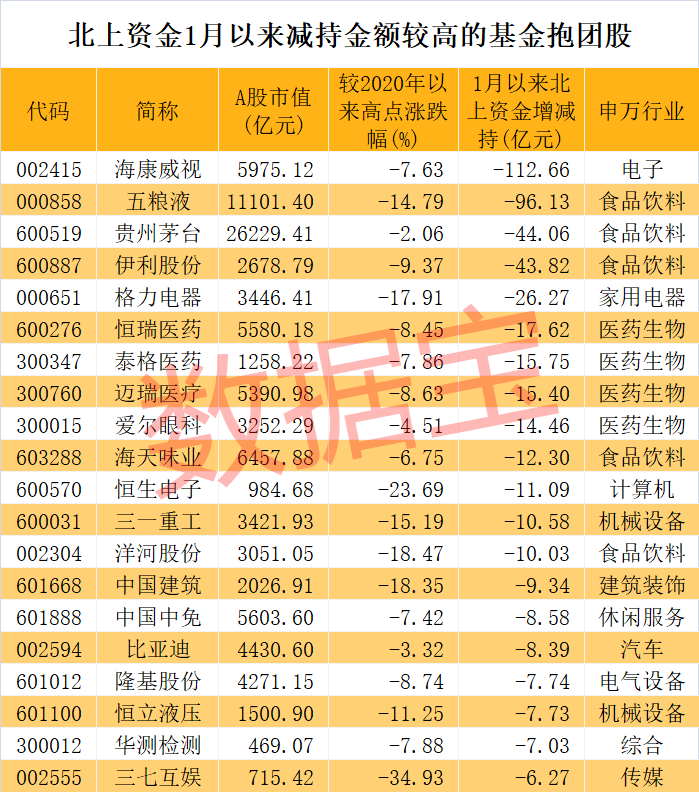 月初持续活跃的北上资金近日开始放缓节奏, 近3个交易日连续呈现净卖出状态,合计净卖出额超110亿元。从1月至今,已有不少基金抱团的白马股遭到北上资金撤离。数据宝统计显示,按照区间成交均价粗略计算,北上资金净卖出超亿元的基金抱团股有44只, 海康威视遭北上资金净卖出额约112.66亿元排在首位。两大市值万亿级消费股五粮液、贵州茅台遭北上资金净卖出额排在第二、第三位,北上资金净卖出额较大的还有伊利股份、格力电器、恒瑞医药、泰格医药、迈瑞医疗等。
