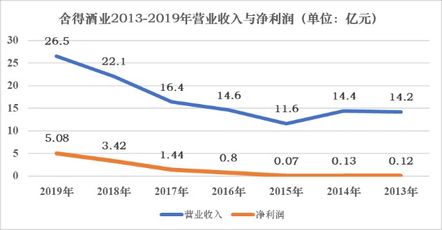 2013年至2015年,舍得酒业营业收入分别为14.19亿元、14.49亿元、11.56亿元,净利润分别为1177万元、1319万元、713万元,此后几年迅速提振:2019年,公司营业收入、净利润分别为26.50亿元、5.08亿元。