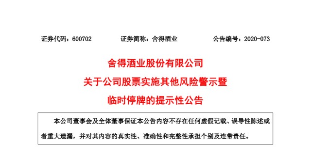 因为“情节严重”,上交所对其股票实施其他风险警示,即“戴帽”被ST。9月21日停牌1天后,9月22日舍得酒业更名为ST舍得。