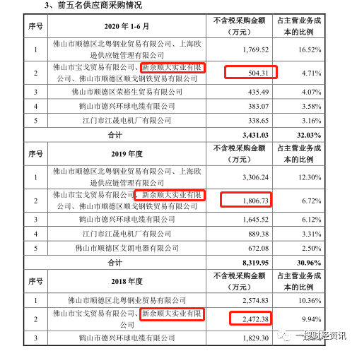 根据招股书信息显示,2018年-2020年上半年新余顺大实业有限公司都是绿岛风的第二大供应商之一,采购额分别为2,472.38万元、1,806.73万元、504.31万元。我们在查看新余顺大实业有限公司的企业信息后发现,新余顺大实业有限公司成立于2017年3月,法人代表隗祖金,注册资本500万元,经营范围钢材、矿产品、五金、化工产品(不含危险化学品和易制毒品)、机电产品、建材、铁精粉销售。