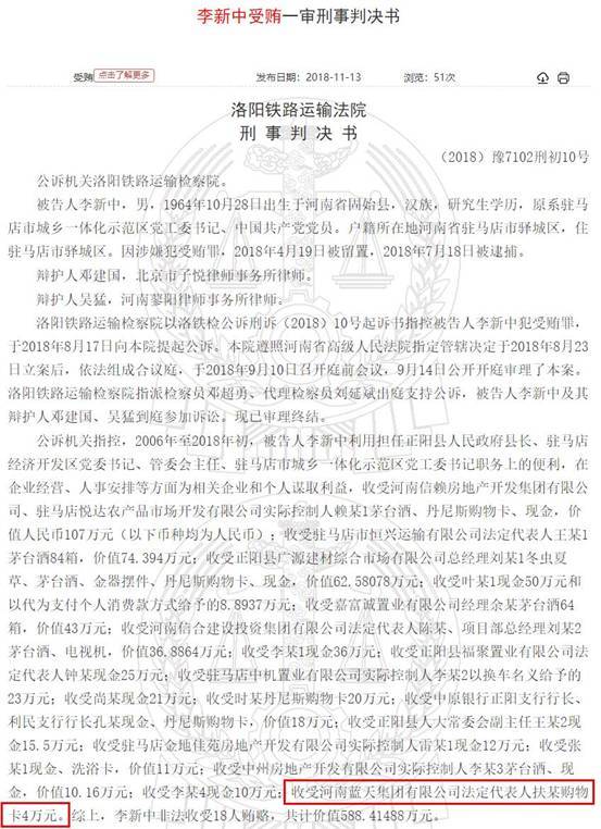 在证监会反馈意见发出前10天,2018年11月13日,蓝天燃气卷入李新中贪腐案被坐实。根据法院判决书,李新中利用担任驻马店市城乡一体化示范区工委书记的职务便利,为蓝天集团开发的蓝天世贸中心项目提供帮助,并先后两次收受蓝天集团法定代表人扶某4万元购物卡。送礼的扶某就是蓝天集团董事、总经理扶廷明。招股书显示,扶廷明还是蓝天燃气前十大股东之一,持有451.2万股。