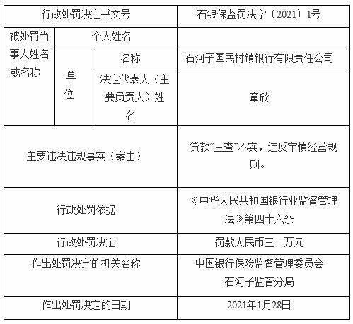 新疆石河子国民村镇银行被罚30万:存在贷款“三查”不实